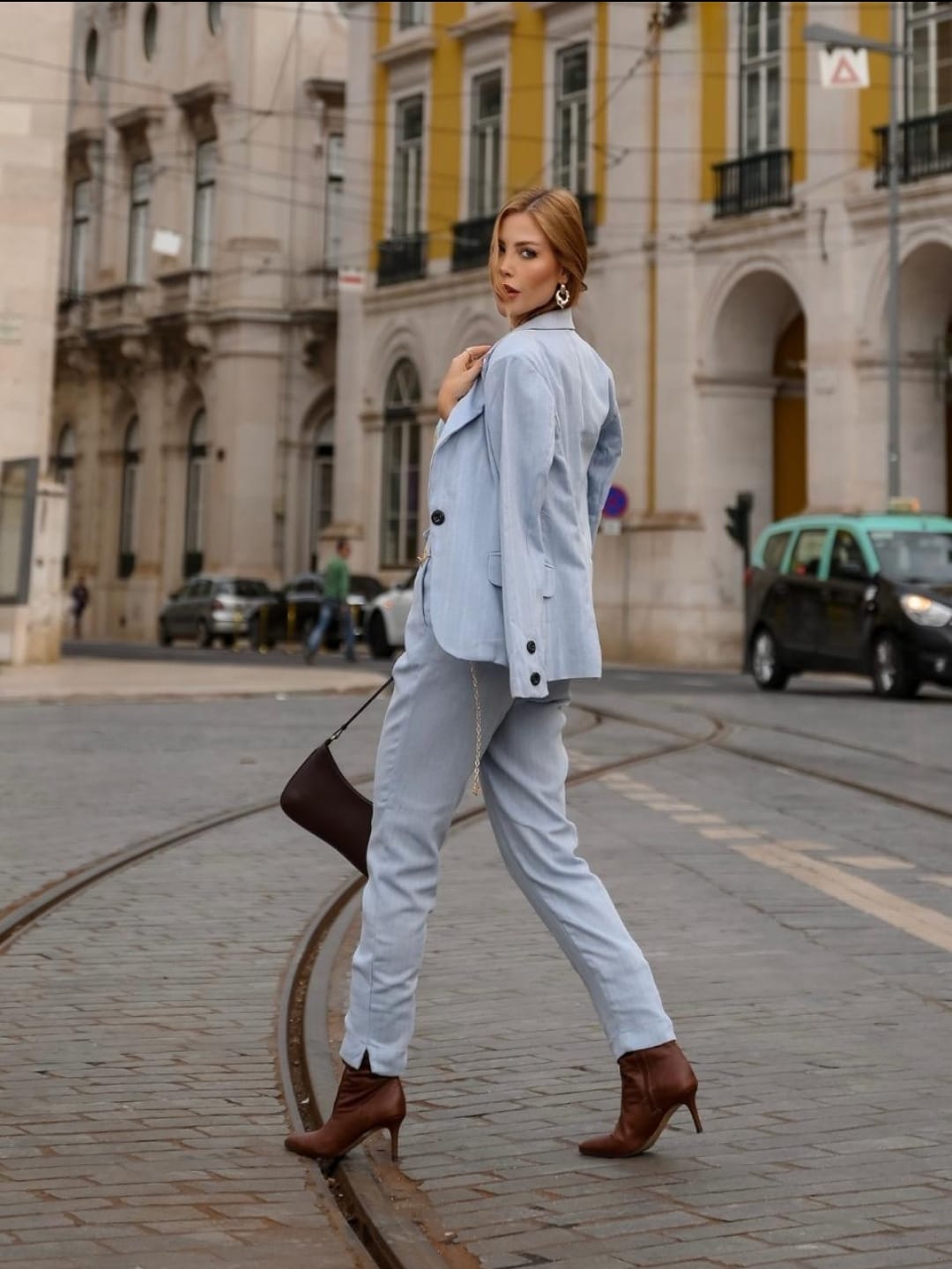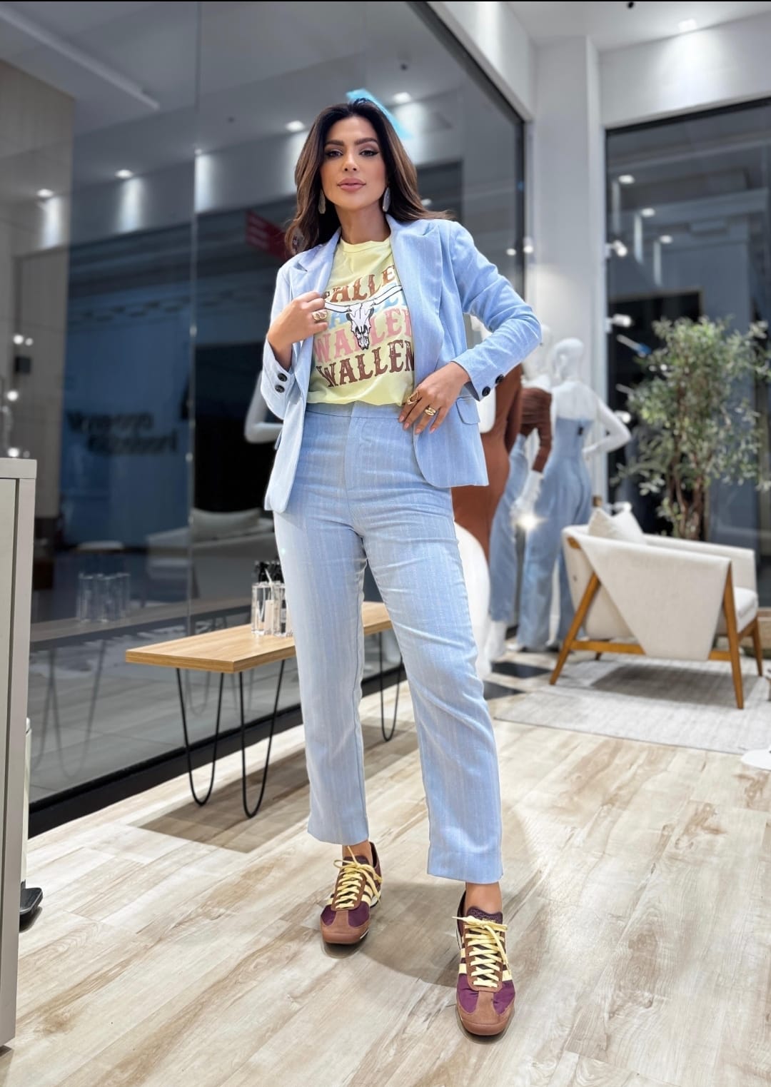 Aspecto de linho, cintura alta, abertura na lateral da barra.