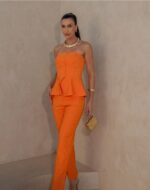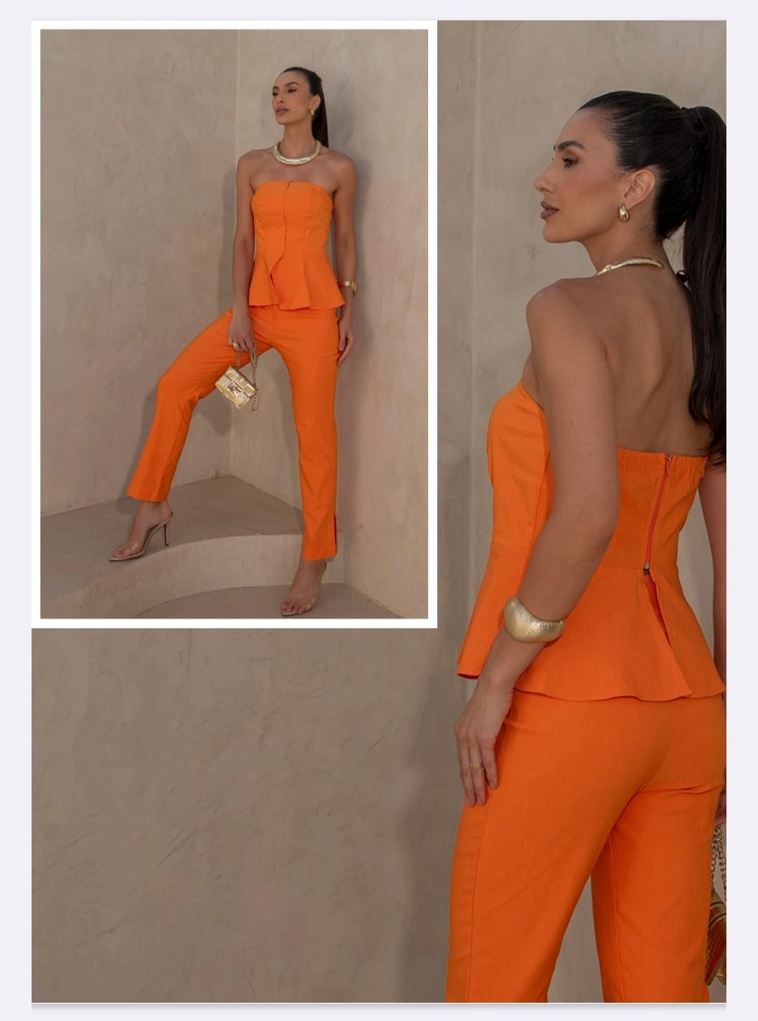 Confeccionado com tecido que molda no corpo. A blusa tomara que caia, modelo peplum com zíper na parte de trás.
