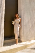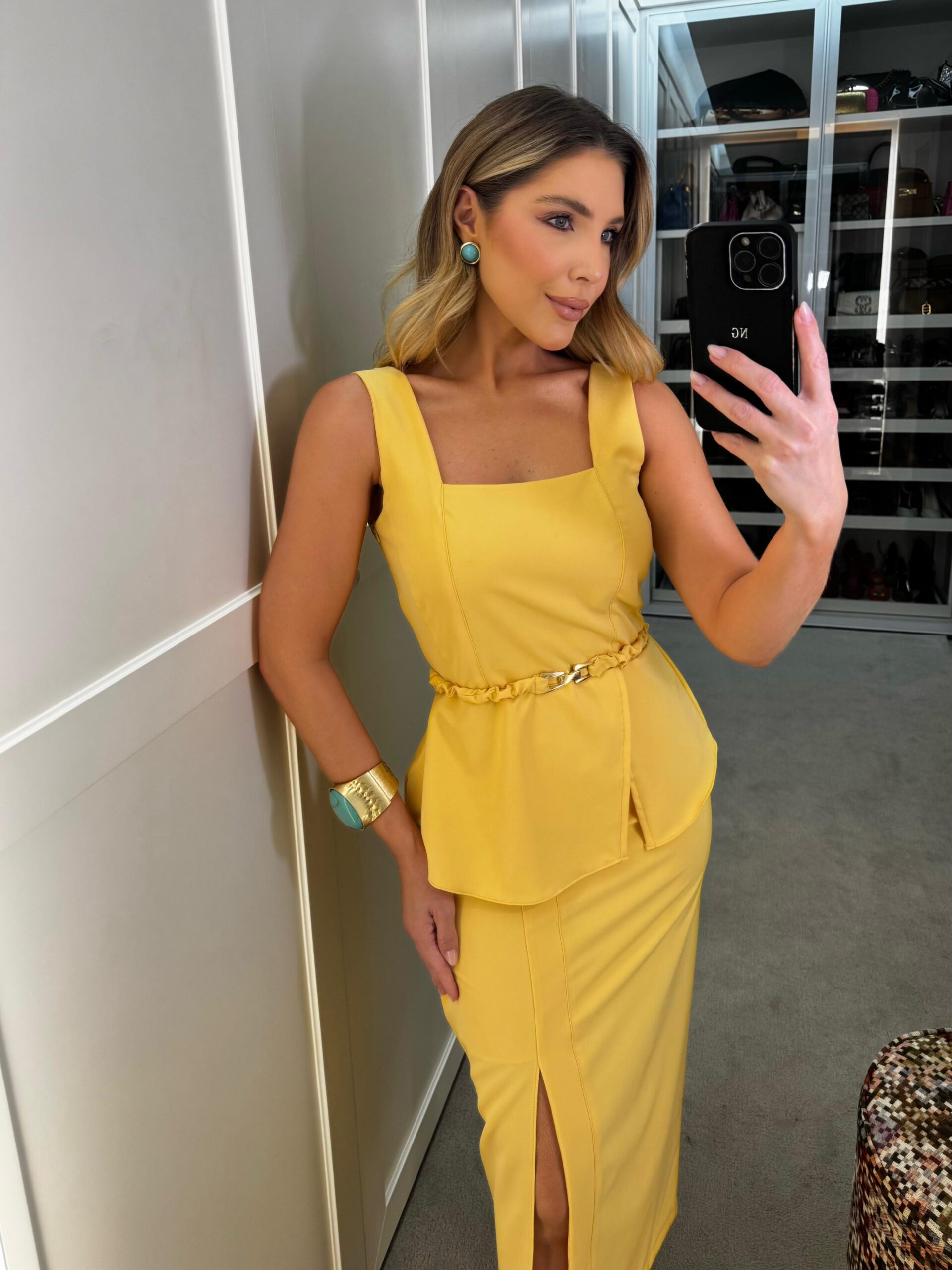 A saia possui zíper na lateral, forro até o joelho e fenda frontal.