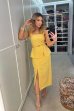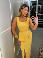 A blusa decote quadrado, zíper lateral, tecido duplo na parte do peito e modelo peplum.