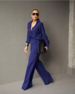 A calça, modelo pantalona, possui elástico na parte de trás do coz, bolsos sobrepostos na frente e atrás.