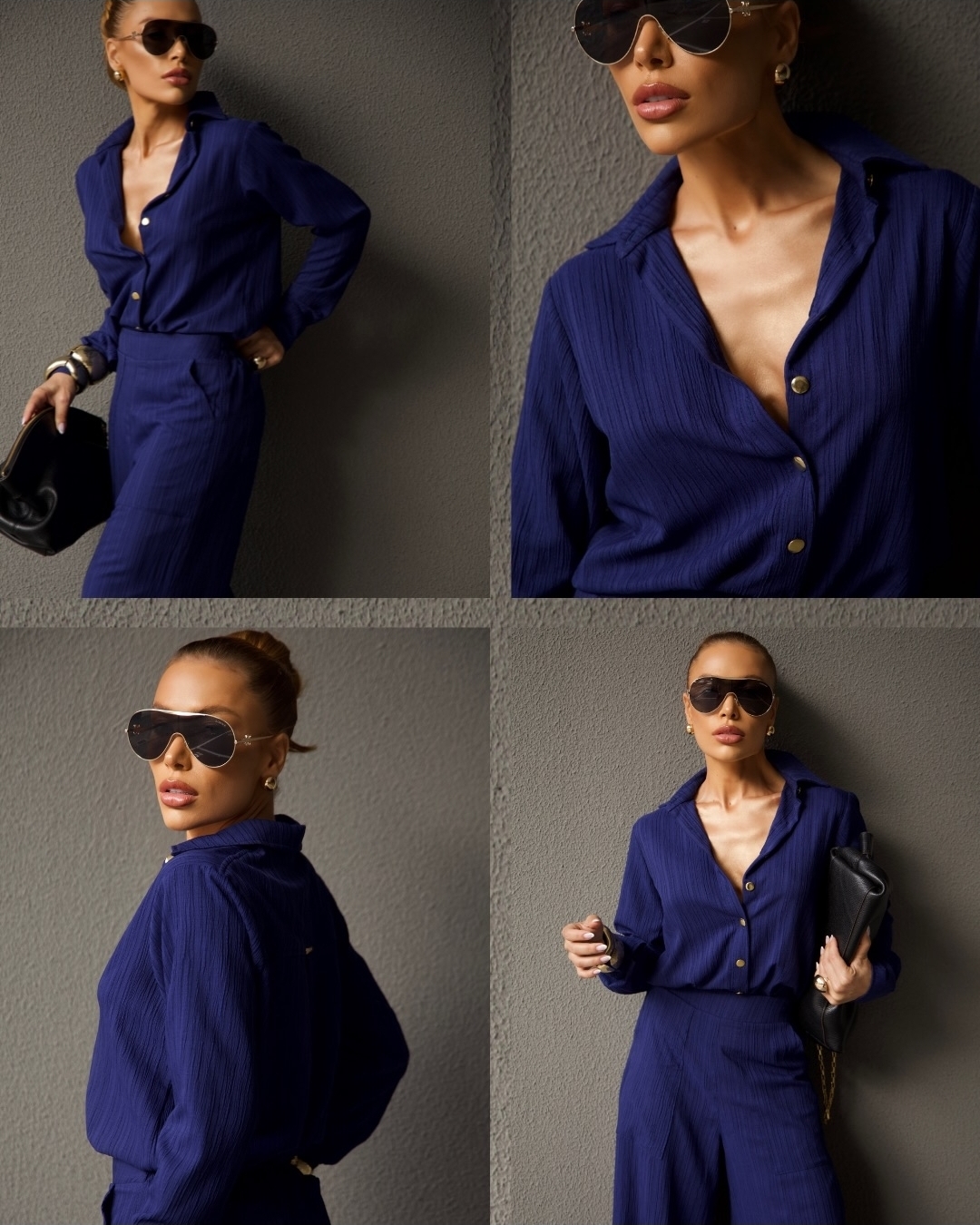 Confeccionado em crepe, a blusa manga longa possui botões dourados e gola de camisa.