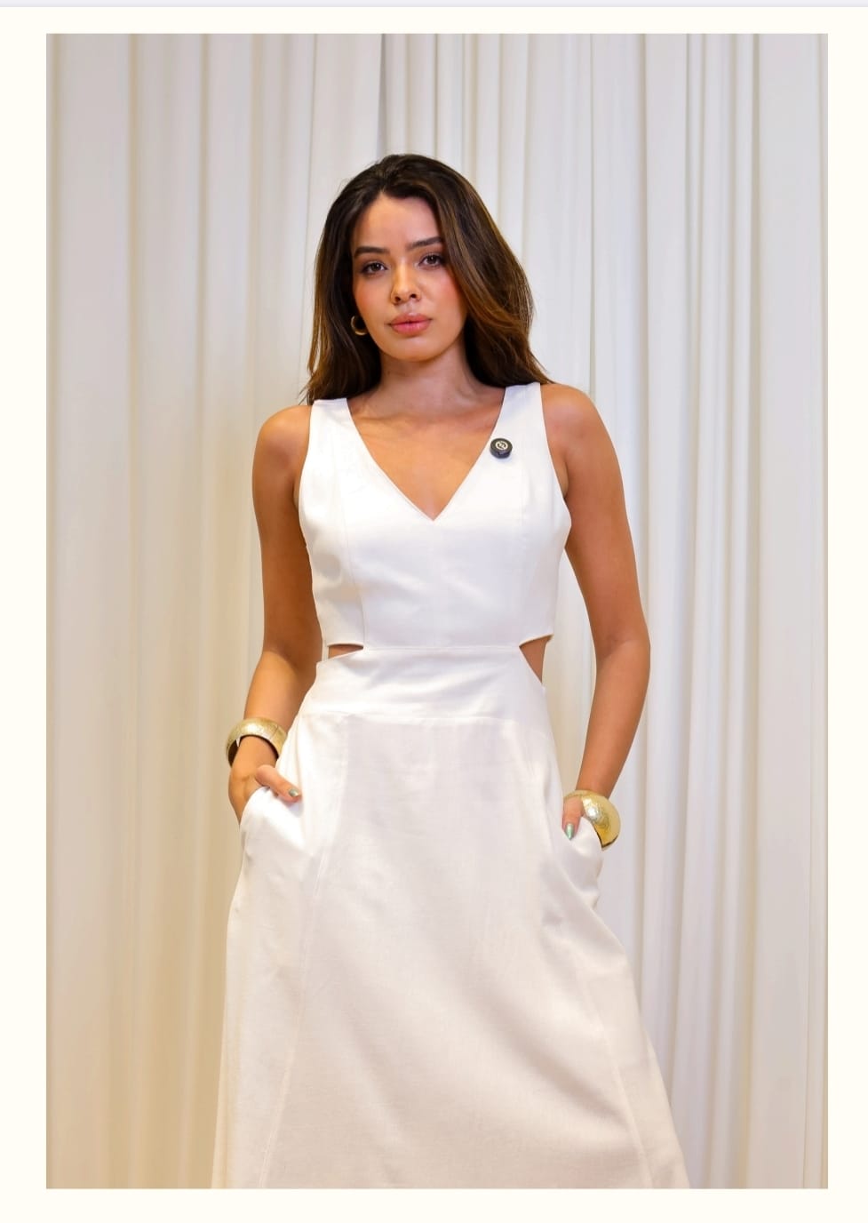 Confeccionado em viscose com linho. Possui decote V, zíper na parte de trás e forro.